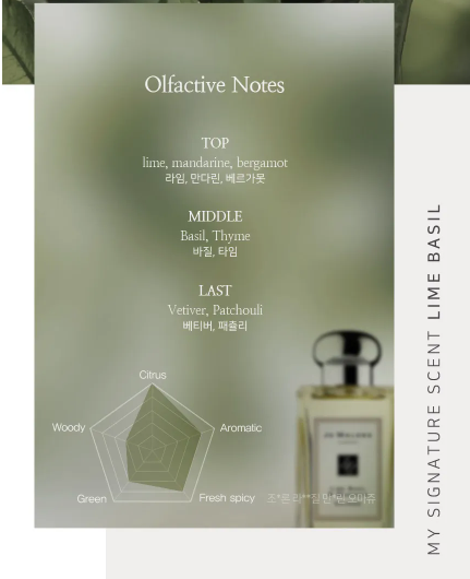 Top: Lime, Mandarine, Bergamot; Middle: Basil, Thyme; Last: Vetiver, Patchouli