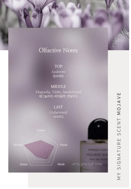 Top: Ambrette; Middle: Magnolia, Violet, Sandalwood; Last: Cedar wood