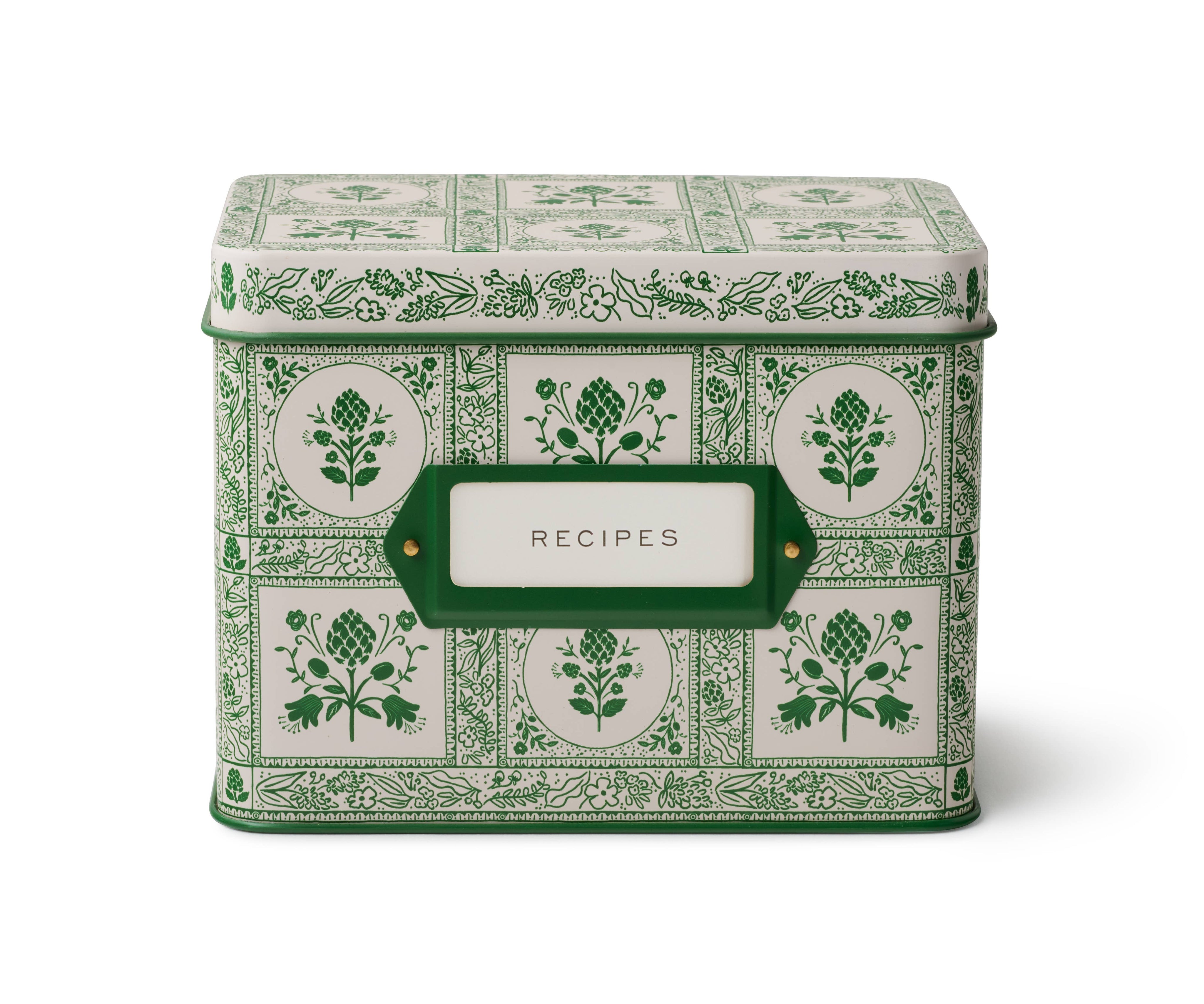 Never lose a family recipe. Holding up to 200 recipe cards, our recipe tins feature printed illustrations, a gold metallic interior, and a gold-framed label, as well as 24 recipe cards and 12 recipe dividers.