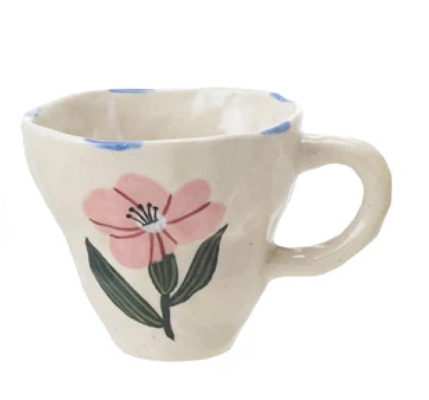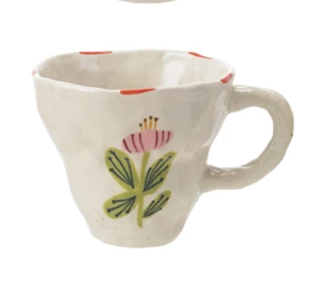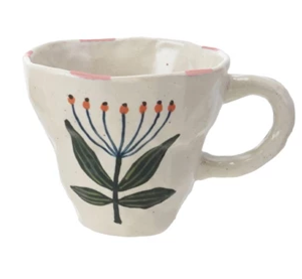 4-1/2" Round x 3-1/2"H 10 oz. Hand-Painted Stoneware Organic Shaped Mug w/ Flower Image, Multi Color, 4 Styles