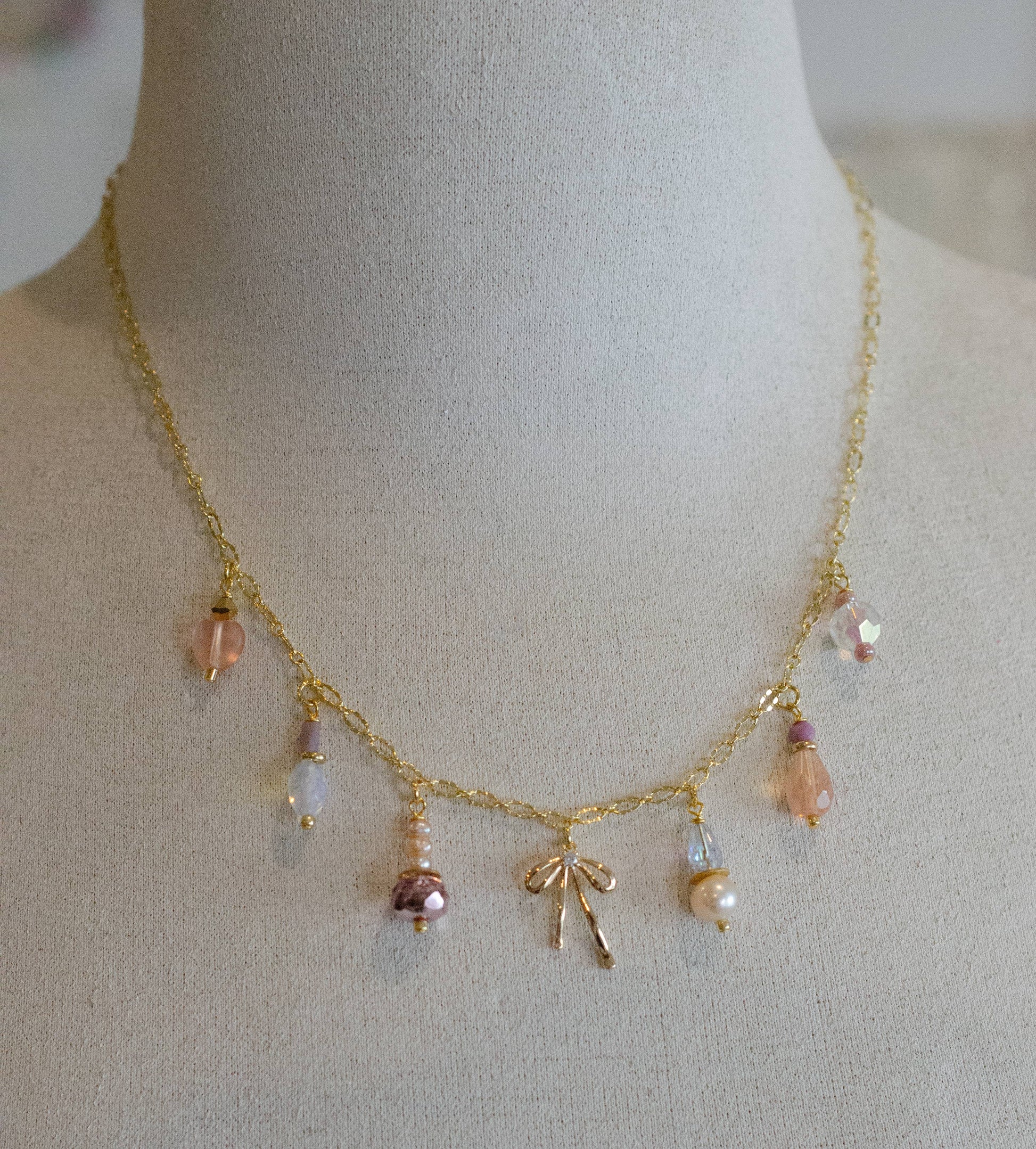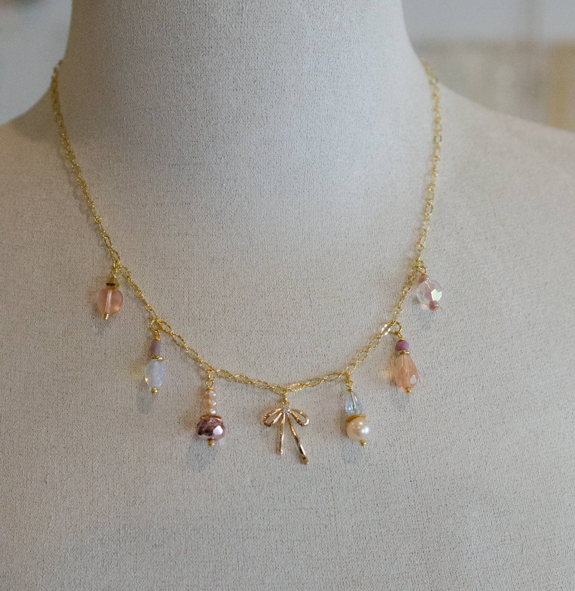 This dainty handmade bow charm necklace adds a delicate accent to any outfit. This necklace features an 18" adjustable cable link chain, allowing you to customize the fit to your preference. It includes seven unique charms: six handmade beaded charms crafted with freshwater pearls, faceted Czech beads, and Swarovski crystals.