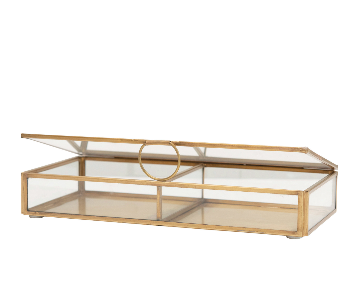 This beauteous brass and glass display box is a treasure for your favorite items. It adds a touch of nostalgia and a vintage feel to your bedroom, living room, kitchen, or office. Place simple decor pieces inside or your favorite letter.
