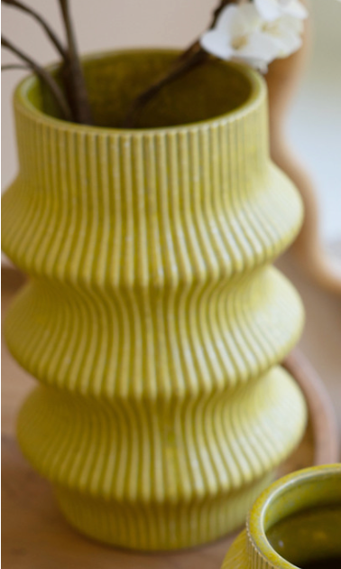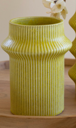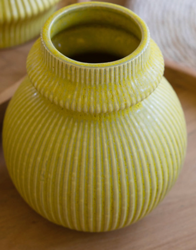 This set of grooved yellow ceramic vases comes in three interesting designs. Keep them grouped for a fun arrangement...