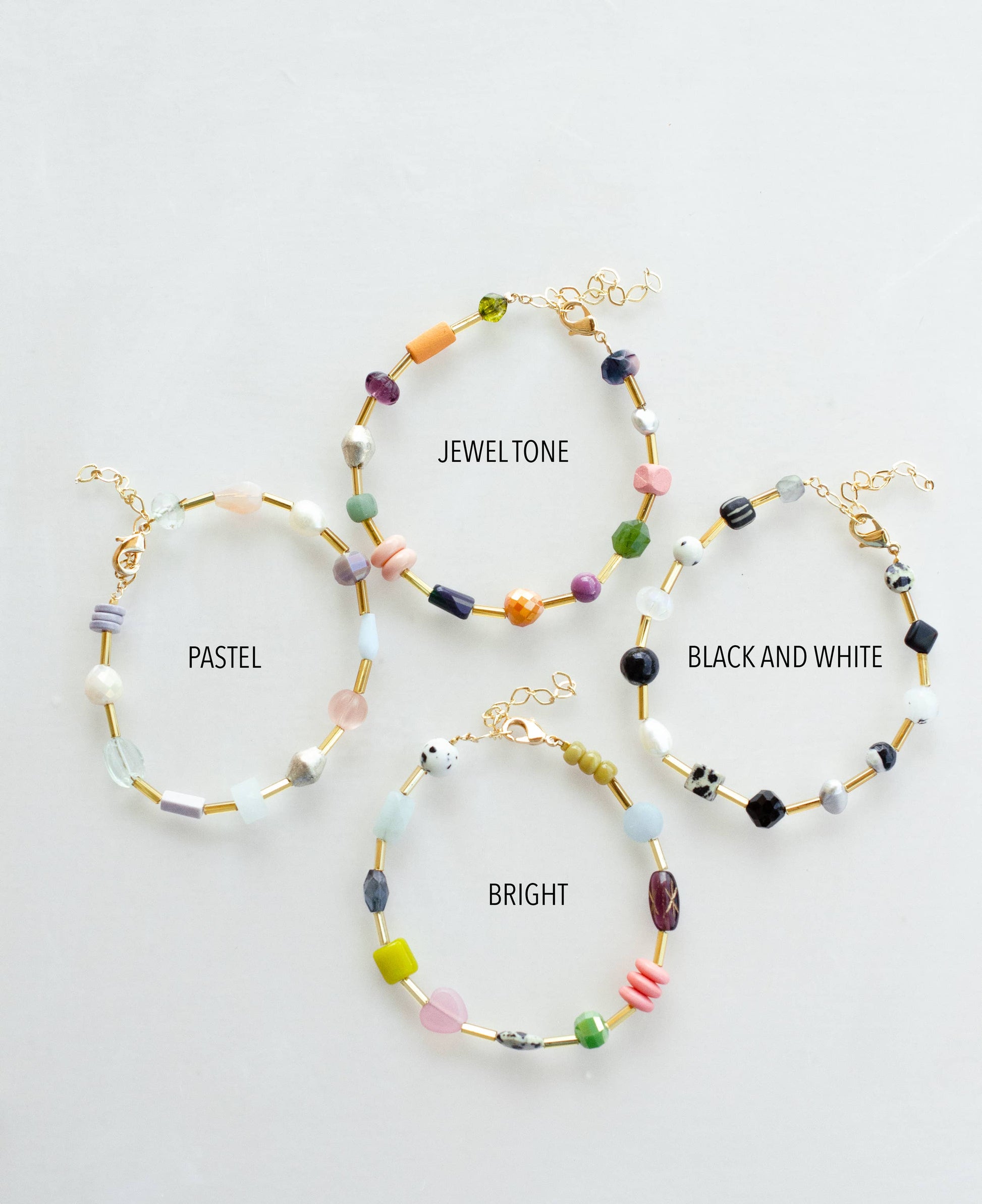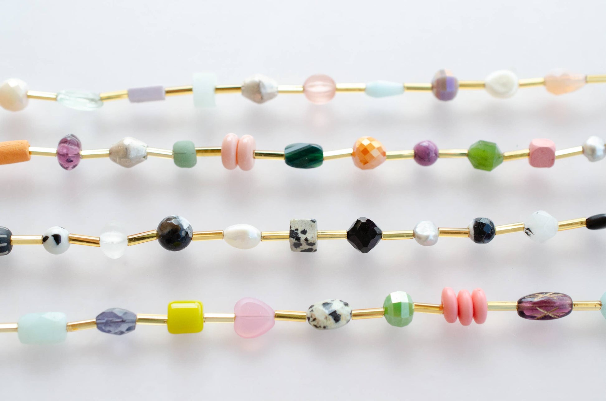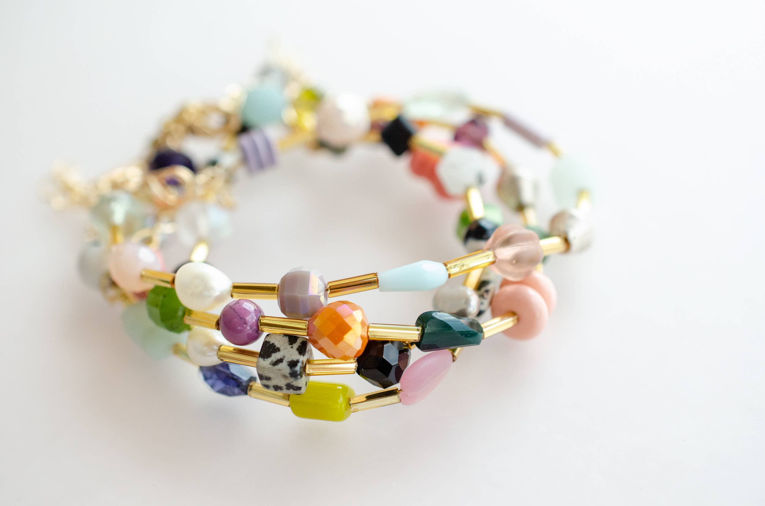 The Mariposa Beaded Bracelet is made of a collection of glass, Czech, and other gemstone beads.