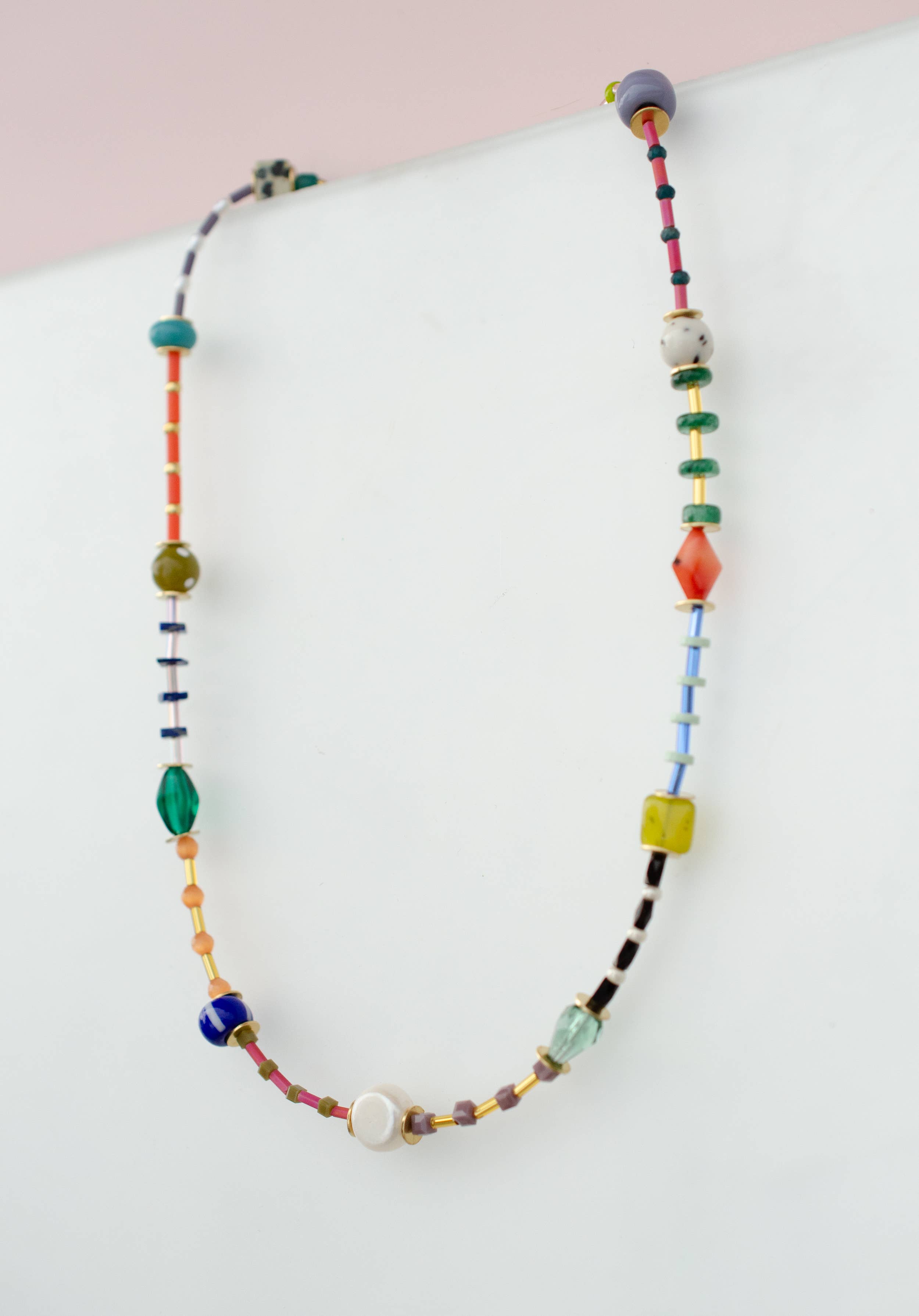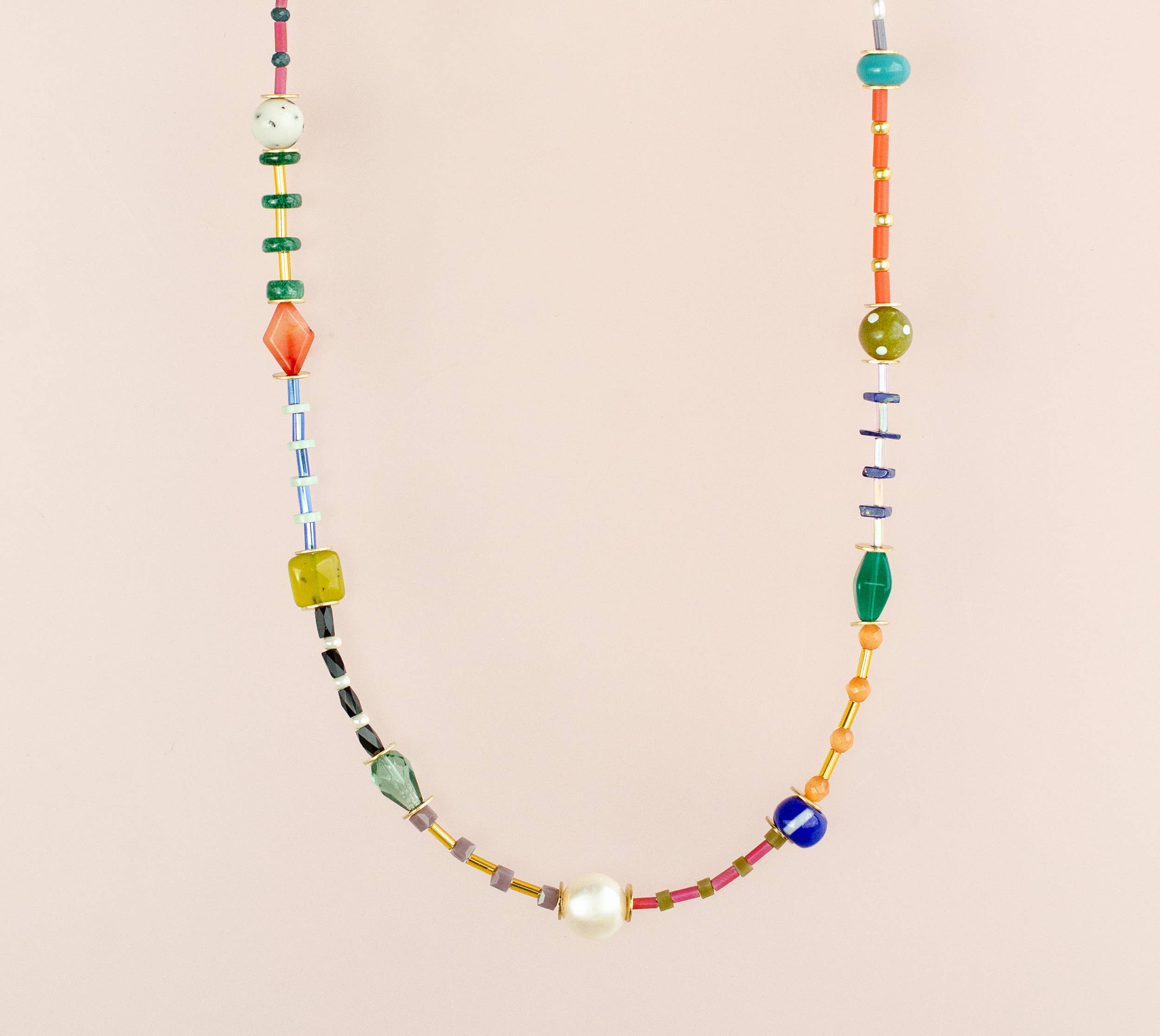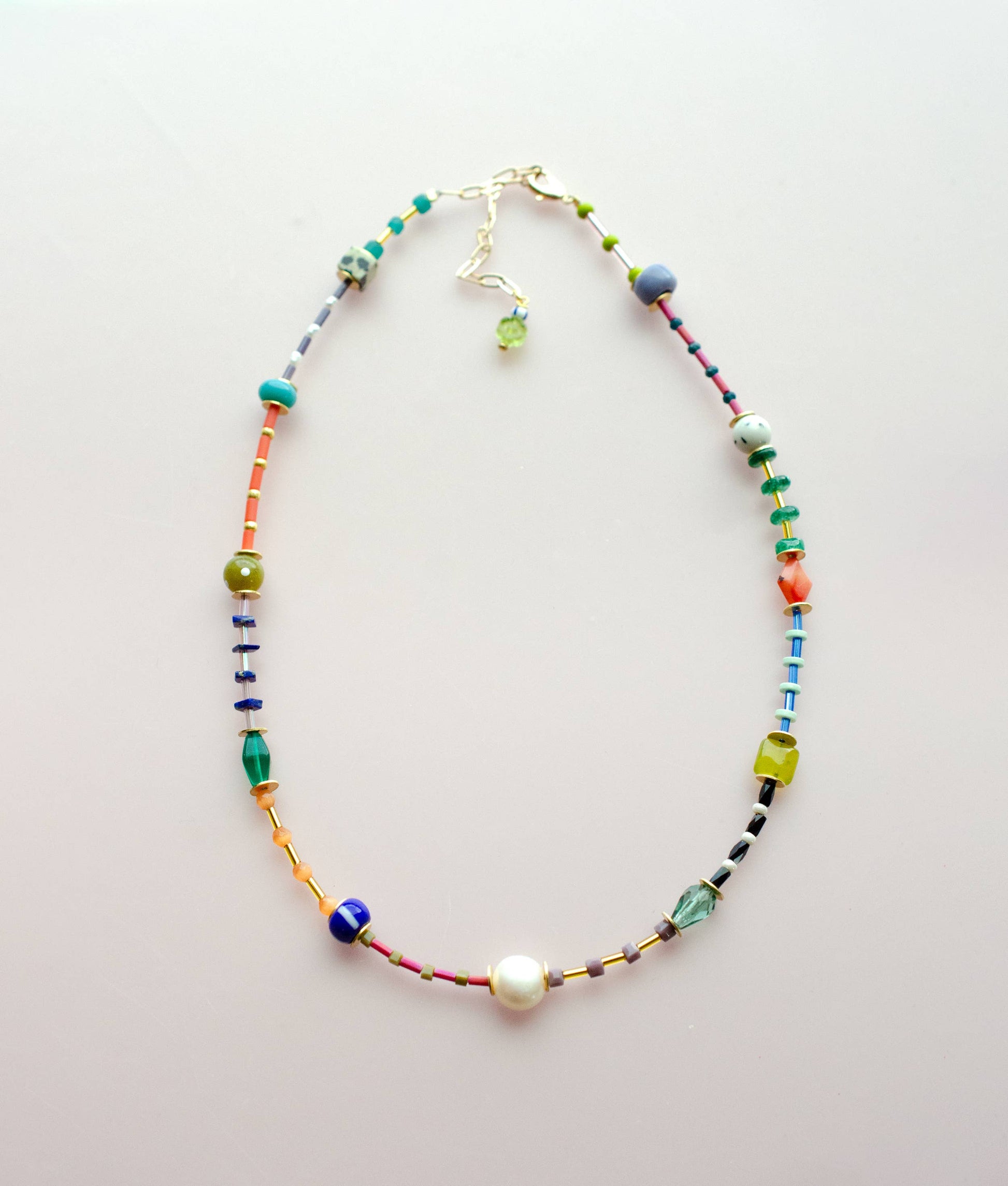 The Beaded Prism Friendship Necklace is made of a collection of glass, Czech, and other gemstone beads.