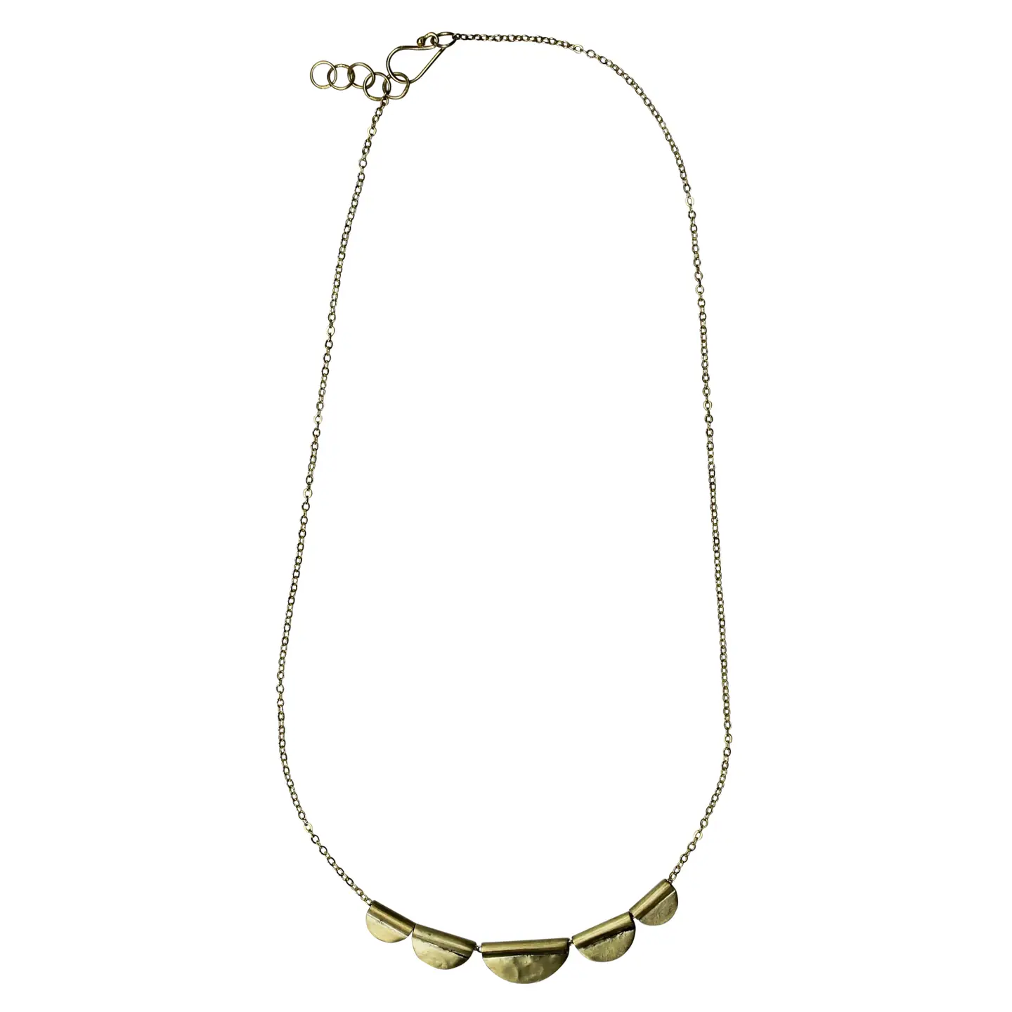 Handmade brass tabs are strung on a thin brass chain creating an easy to wear necklace with gentle movement.