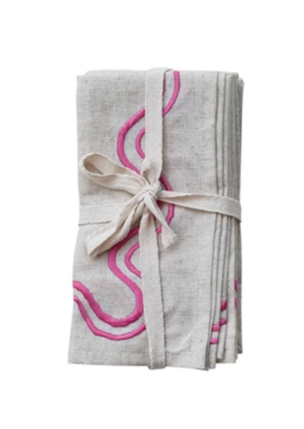 18" Square & Linen Napkins w/ Embroidered Wavy Lines, Natural, Pink & Red