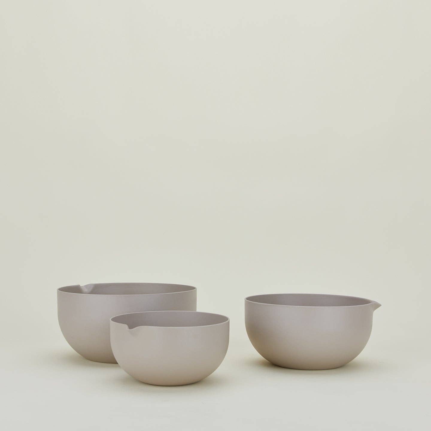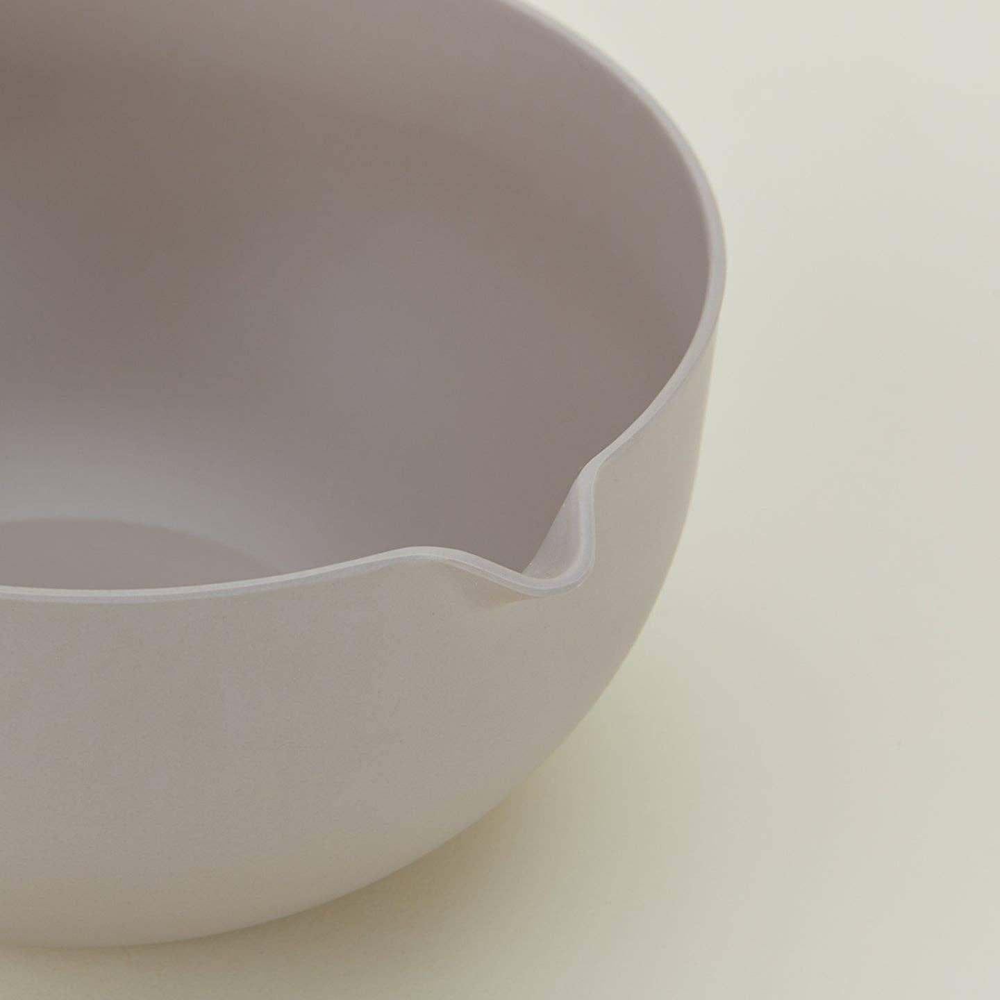 Set of three recycled bamboo fiber mixing bowls High, straight sides and a generous pouring spout for mess-free, worry-free culinary creativity.
