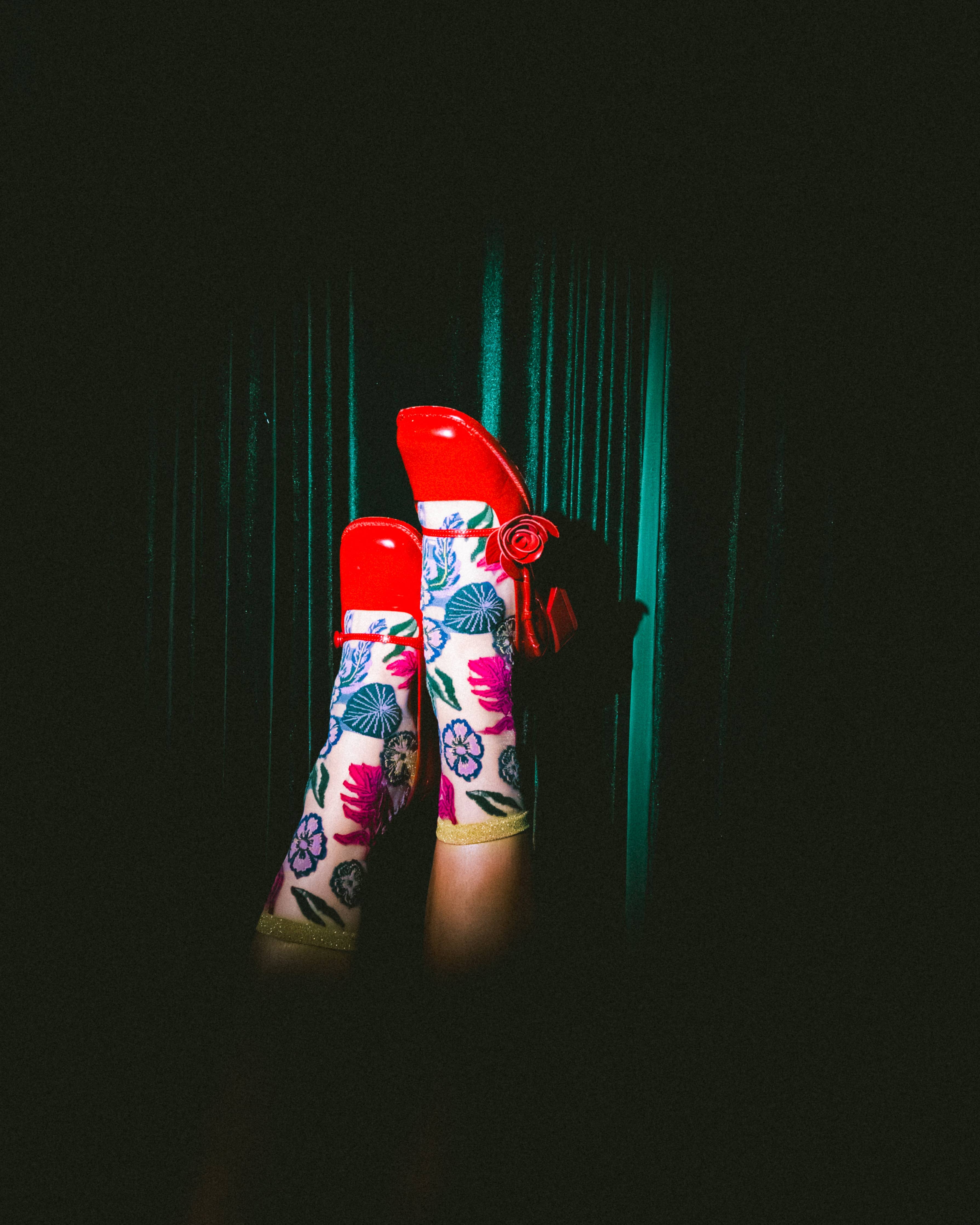 Looking for a floral sock that can work for all your celebratory festivities? Our Festive Floral sheer sock is guarantee to become your go-to style, decked out in navy and green winter florals paired with a gold shimmer heel and cuff. Dress it up with brocade heels or dress it down with sneakers.