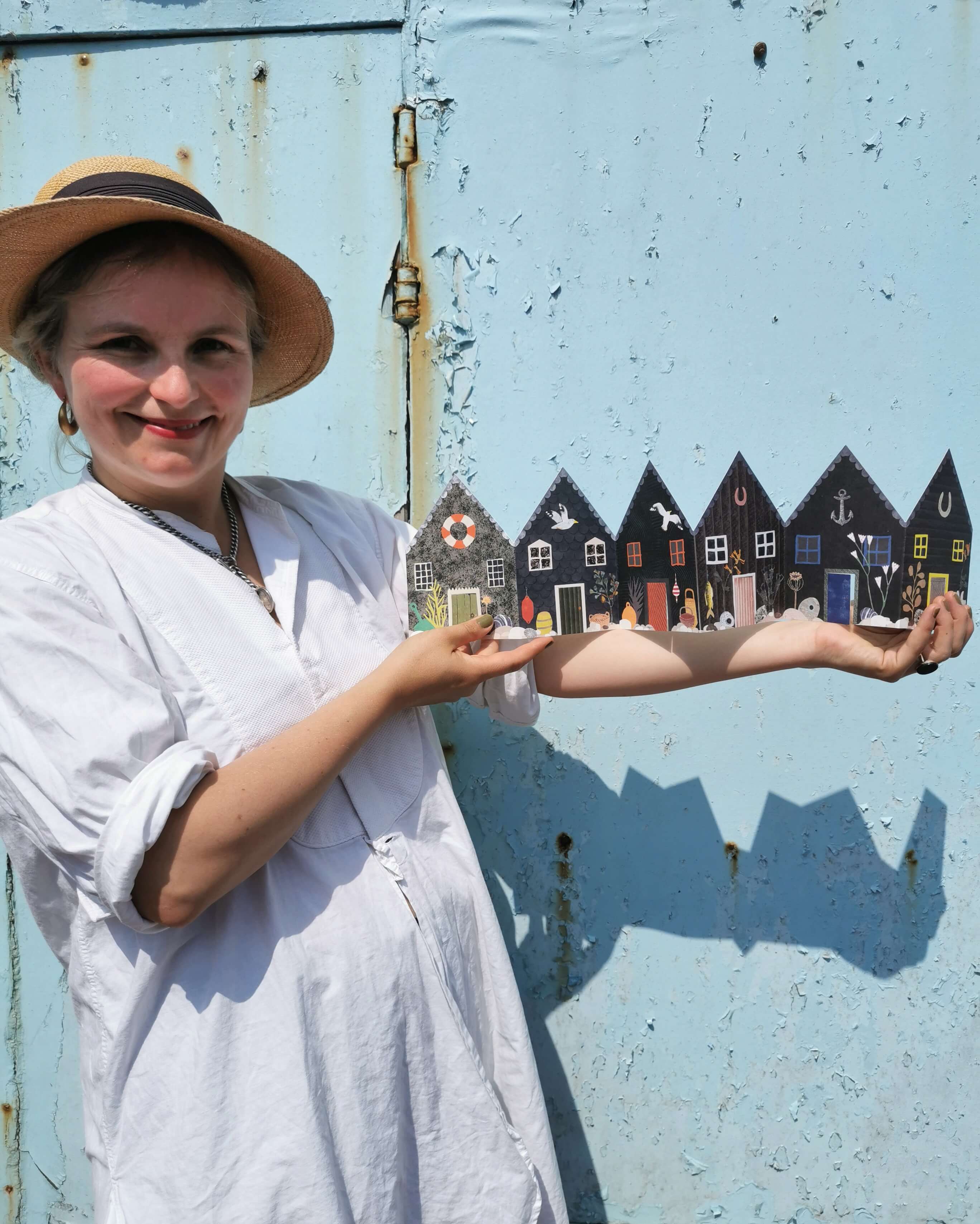 Featuring six fisherman's huts, each unique in its design with gorgeous attention to detail such as fish, shells, baskets and plants. Designed using a classic combination of oil pastels, badly pressed flowers, cut outs from a book about fisherman's jumpers and marbling.