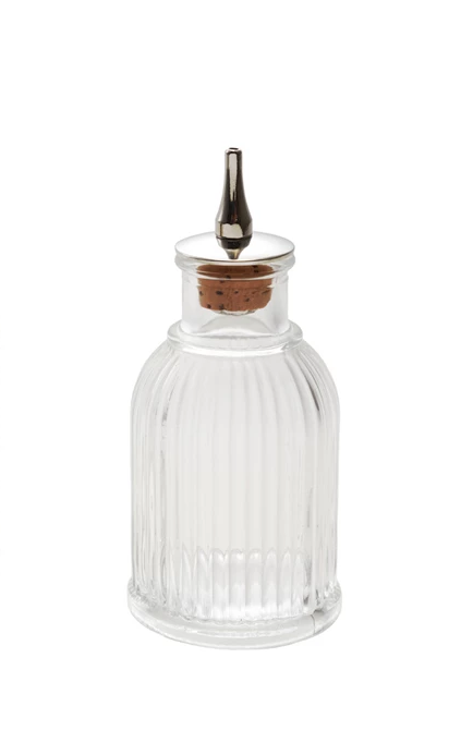 Add style and texture to your bar with a pressed glass bitters bottle. Available in two styles, each has a stainless steel and cork spout.