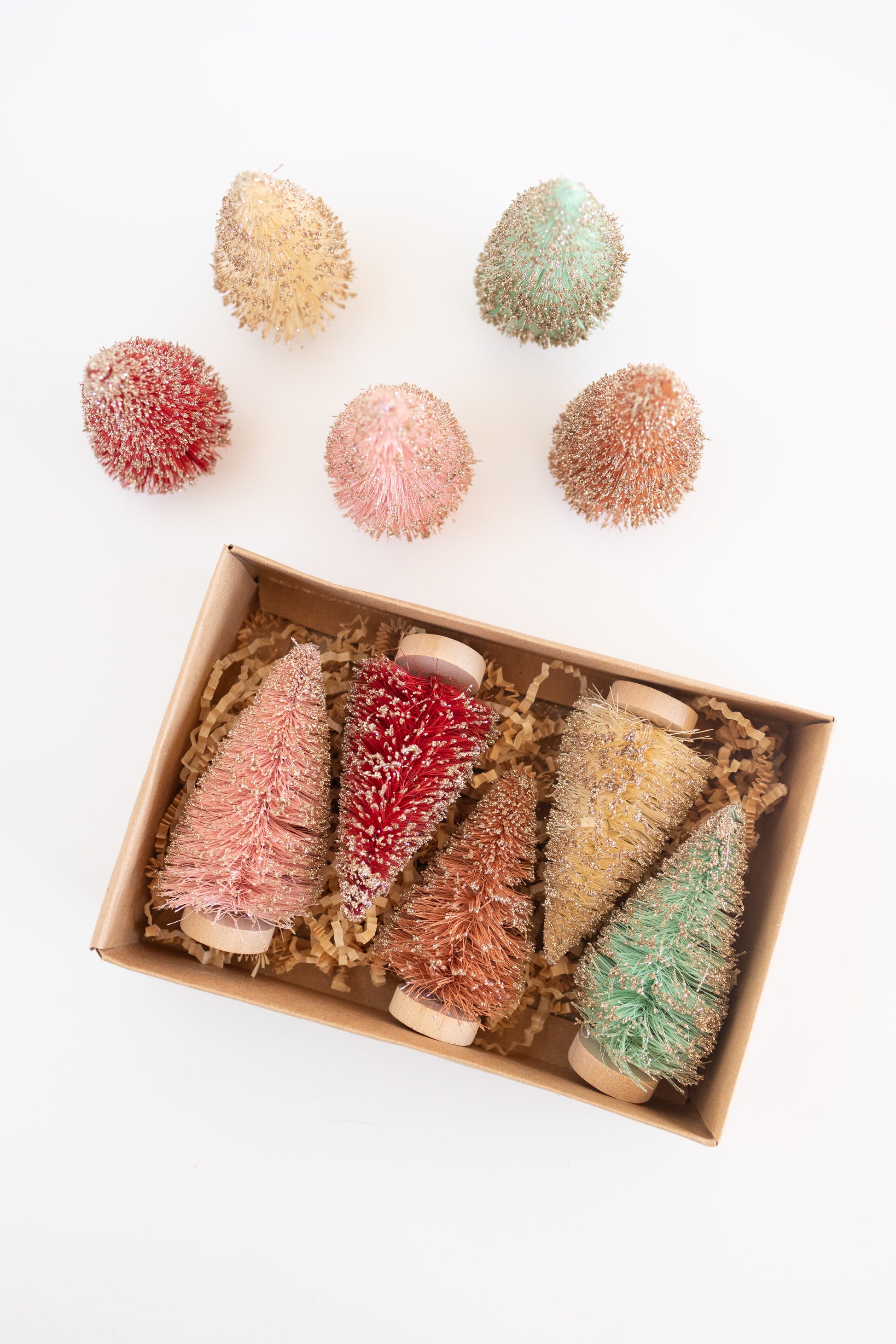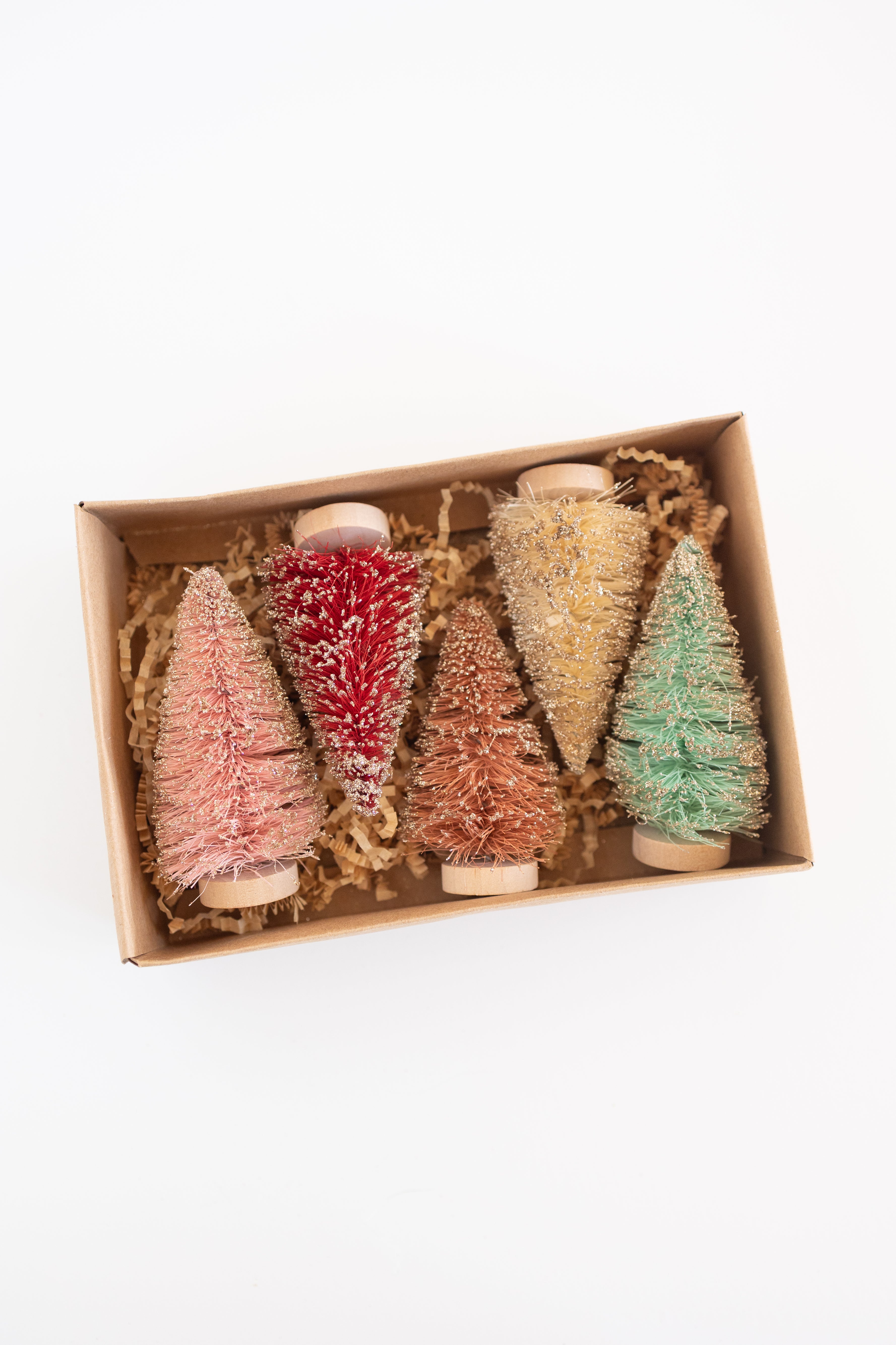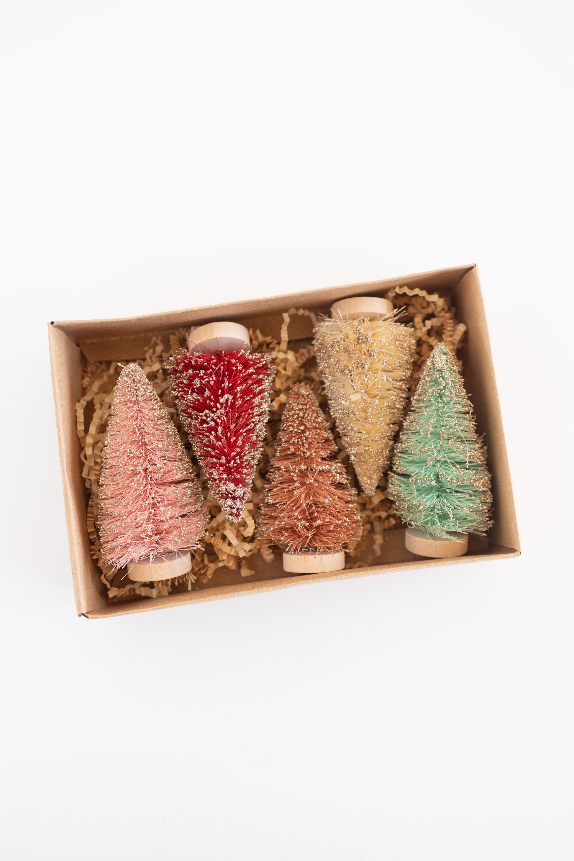3"H Sisal Bottle Brush Trees w/ Glitter & Wood Bases, Multi Color, Boxed Set of 5