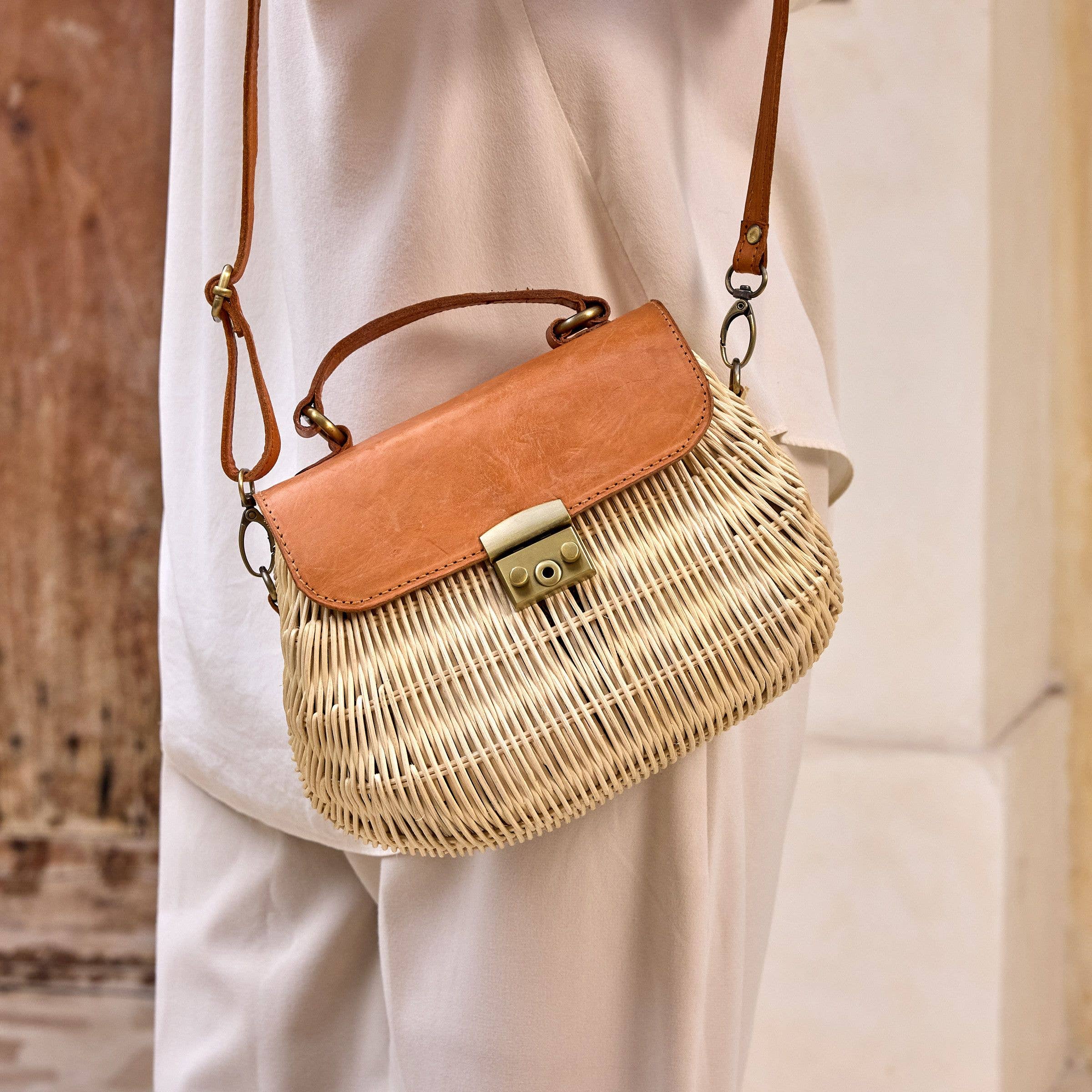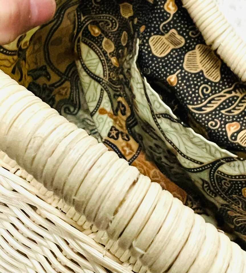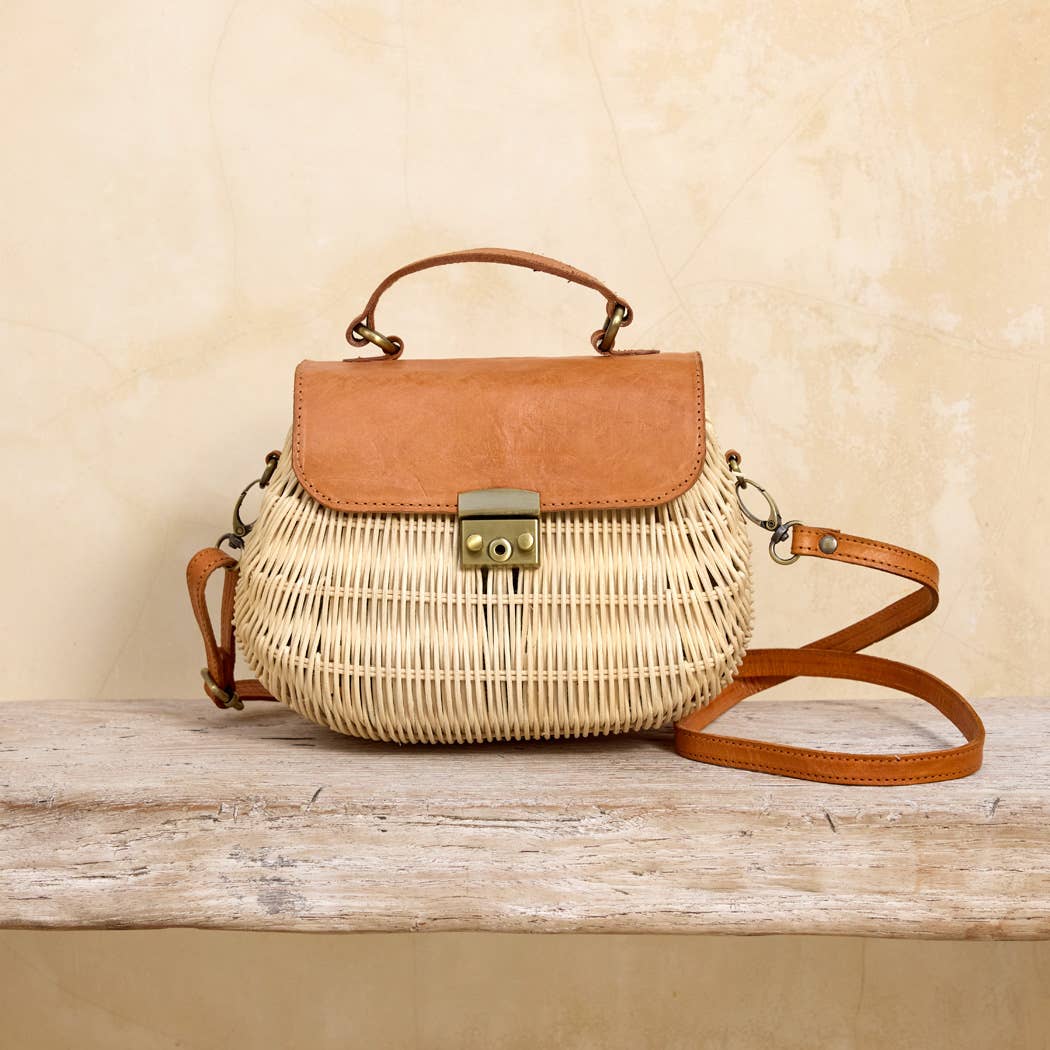 Ivory rattan with premium leather trim, snap closure, adjustable crossbody strap and batik print lining. Natural rattan sourced from sustainable forests in Kalimantan, Borneo. Here, farmers harvest only mature plants and replace them with new vines, thereby ensuring the forest thrives for future generations.