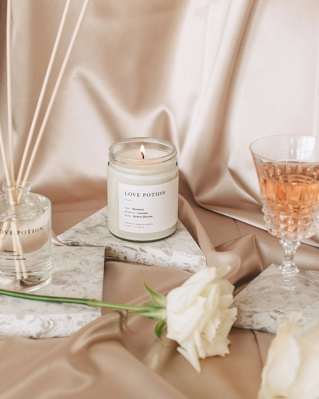 Exotic notes of jasmine blossoms, calming lavender, and bright mandarin—an olfactory experience reminiscent of a freshly picked bouquet of wildflowers. Hand poured into elegant straight sided clear glass jars with modern minimalist labels.