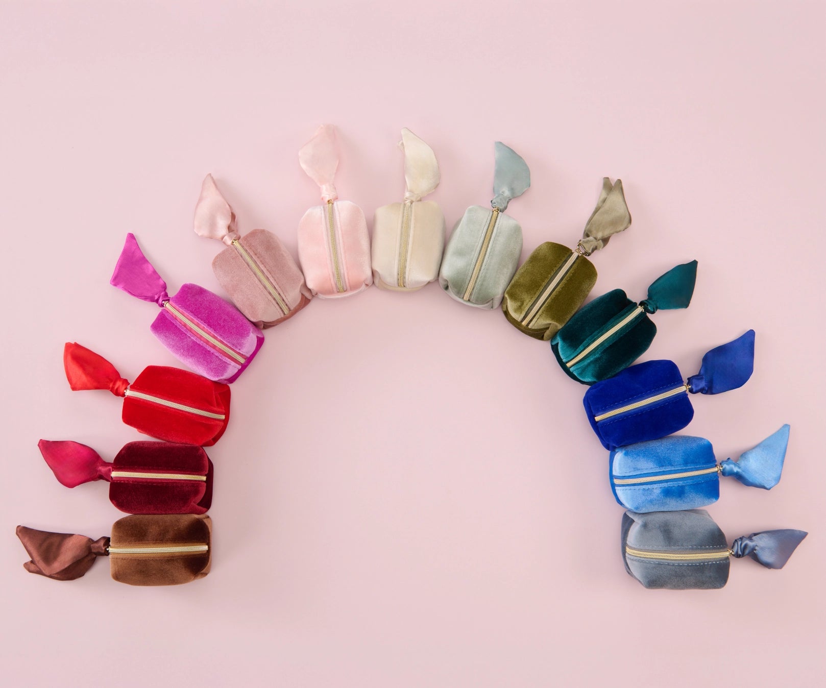 Each soft velvet pouch with a matching silky scarf zipper pull contains 17 beauty, personal care, and style essentials...everything you need in a pinch!