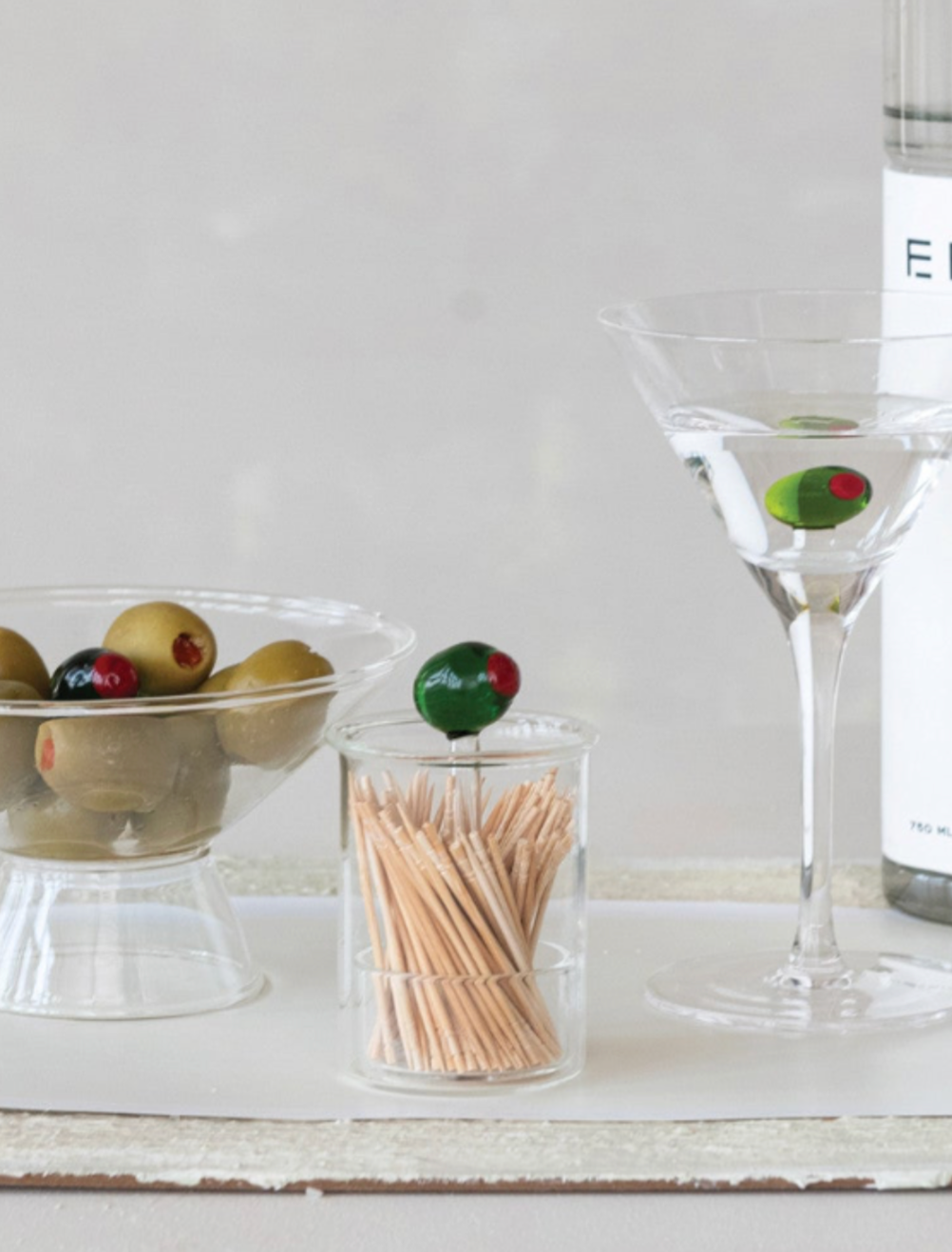 2-1/2" Round x 4"H Glass Toothpick Holder w/ Hand-Blown Olive, Green & Red