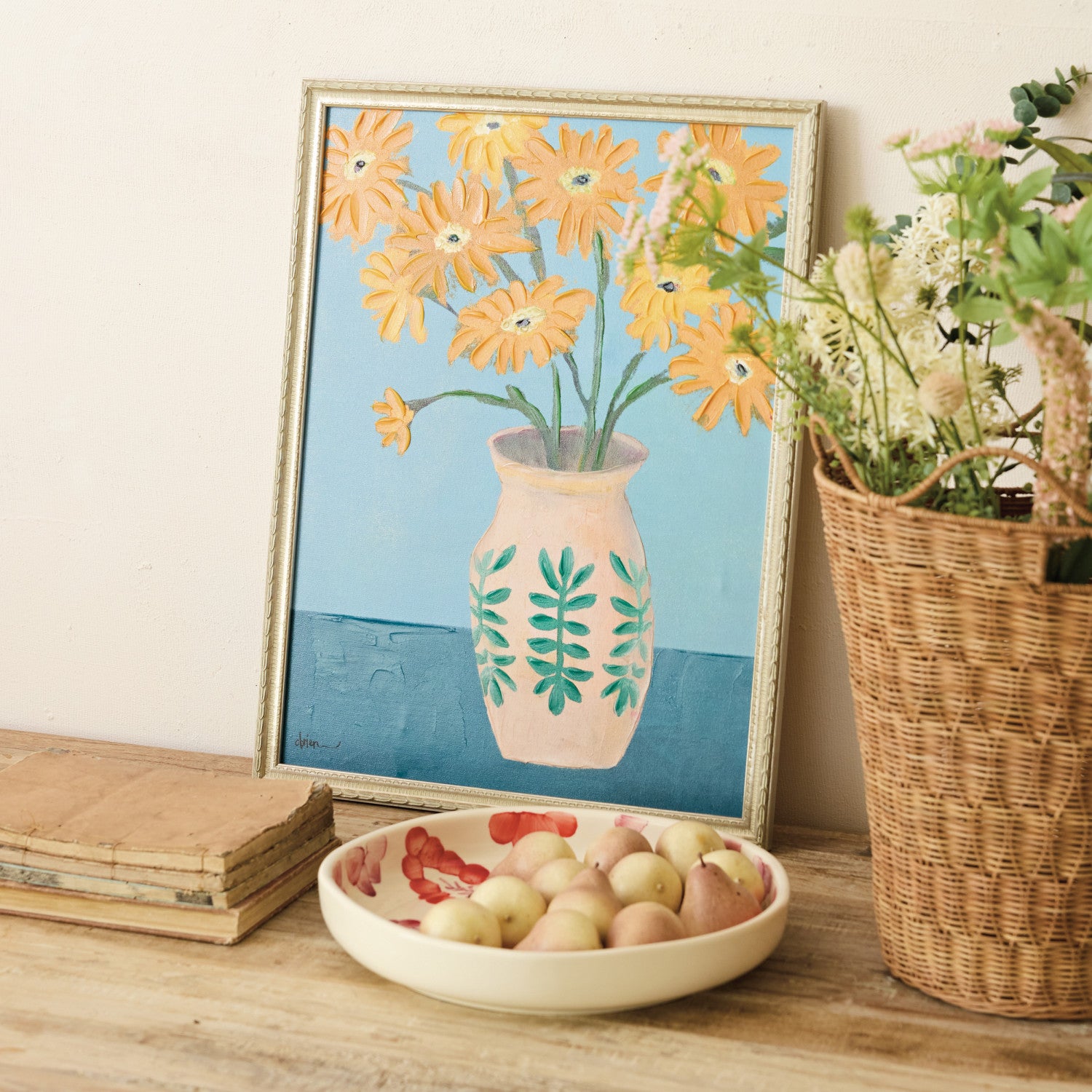 Stunning orange daisies in a leaf adorned vase are painted on a cotton canvas.18"W x 24"HIn-store pick up only.All ar...