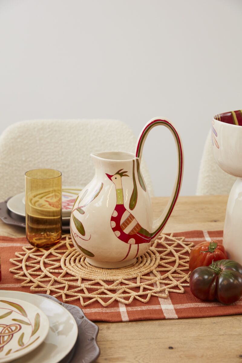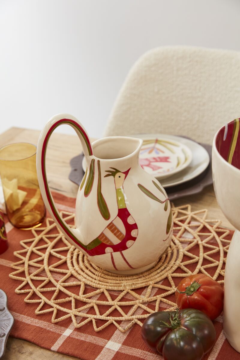 Artist Jessica Hiemstra livens up any table with her folk art-inspired creations & mix of color & pattern. The oversized, hand painted Parable Pitcher is full of personality with a modern, curved-arch handle, a botanical motif on a neutral base exterior color. This food-safe sculptural vessel is ideal as a serving piece, for displaying objects, or holding an arrangement of flowers.