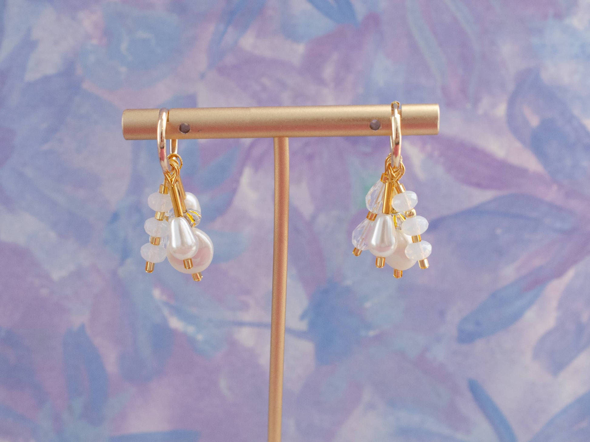 These earrings are made with freshwater pearls and Czech glass beads, arranged on 14mm gold-plated hoops. The mix of round and teardrop shapes gives them a layered look.