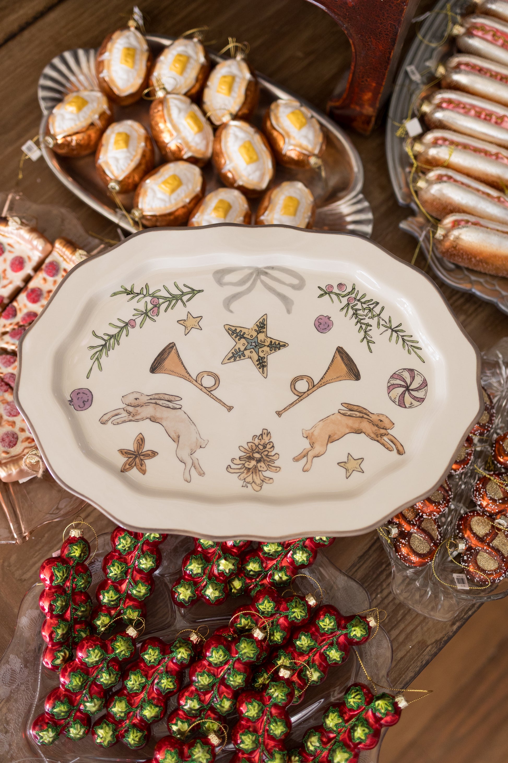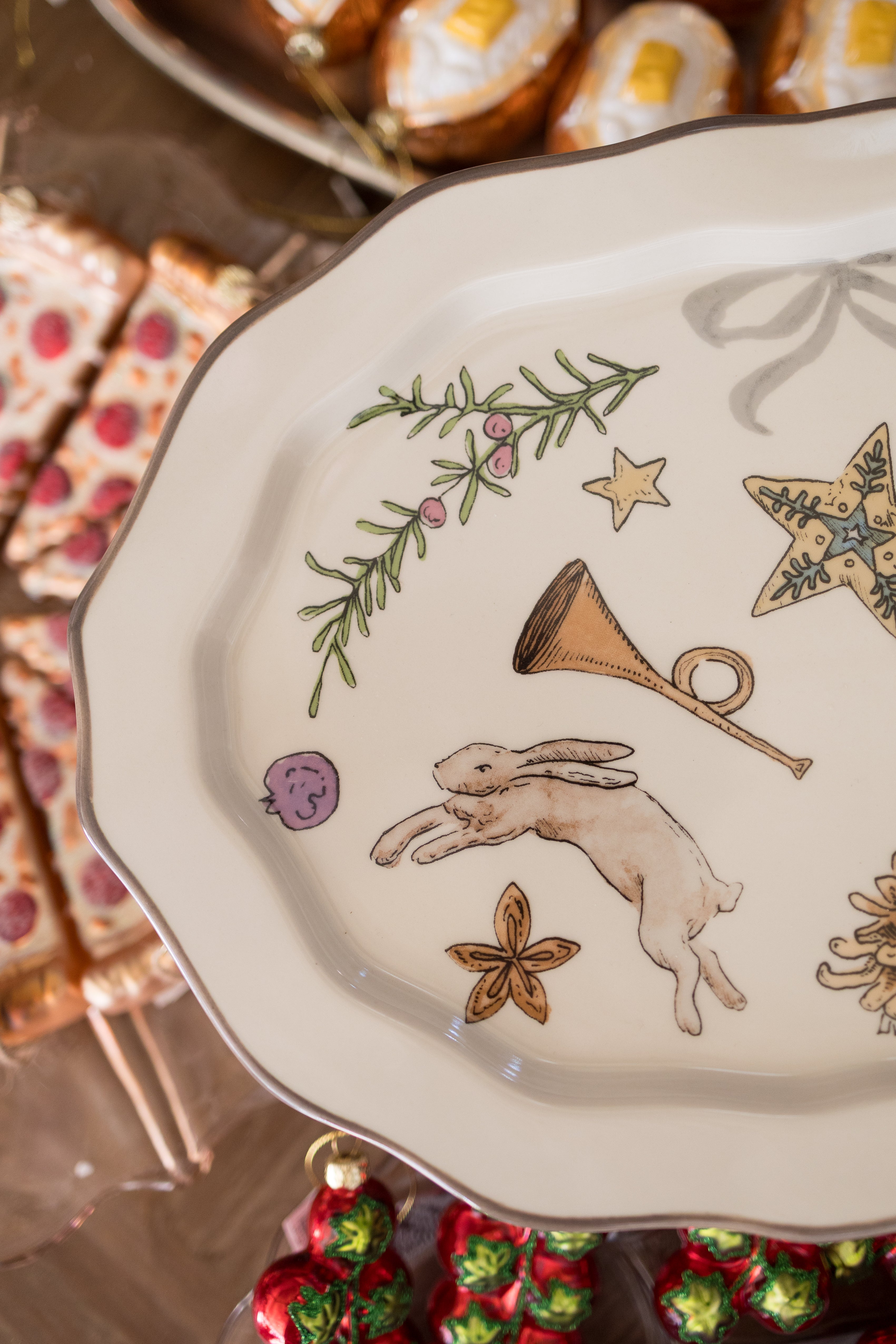 Stoneware Scalloped Platter with Holiday Image & Colored Edge14"Lx10"W