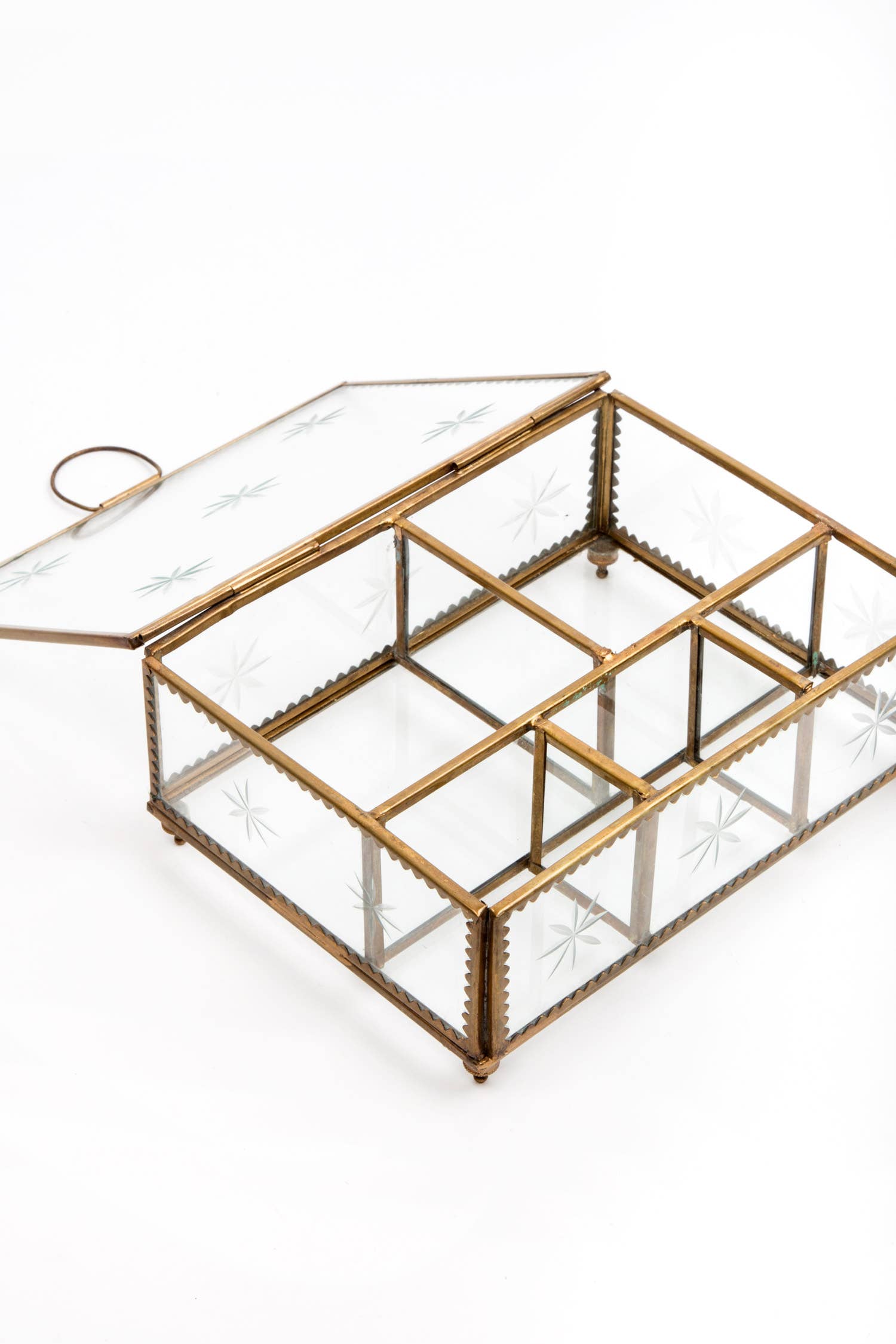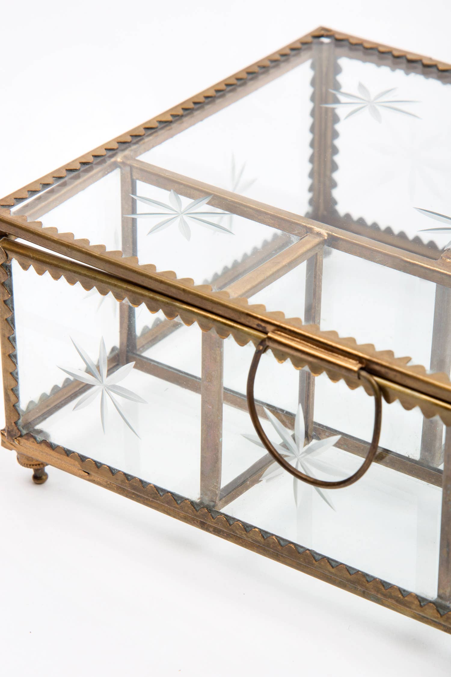 Our classic brass star jewelry box featuring etched glass, is handcrafted in Moradabad, India with an antique fish an...