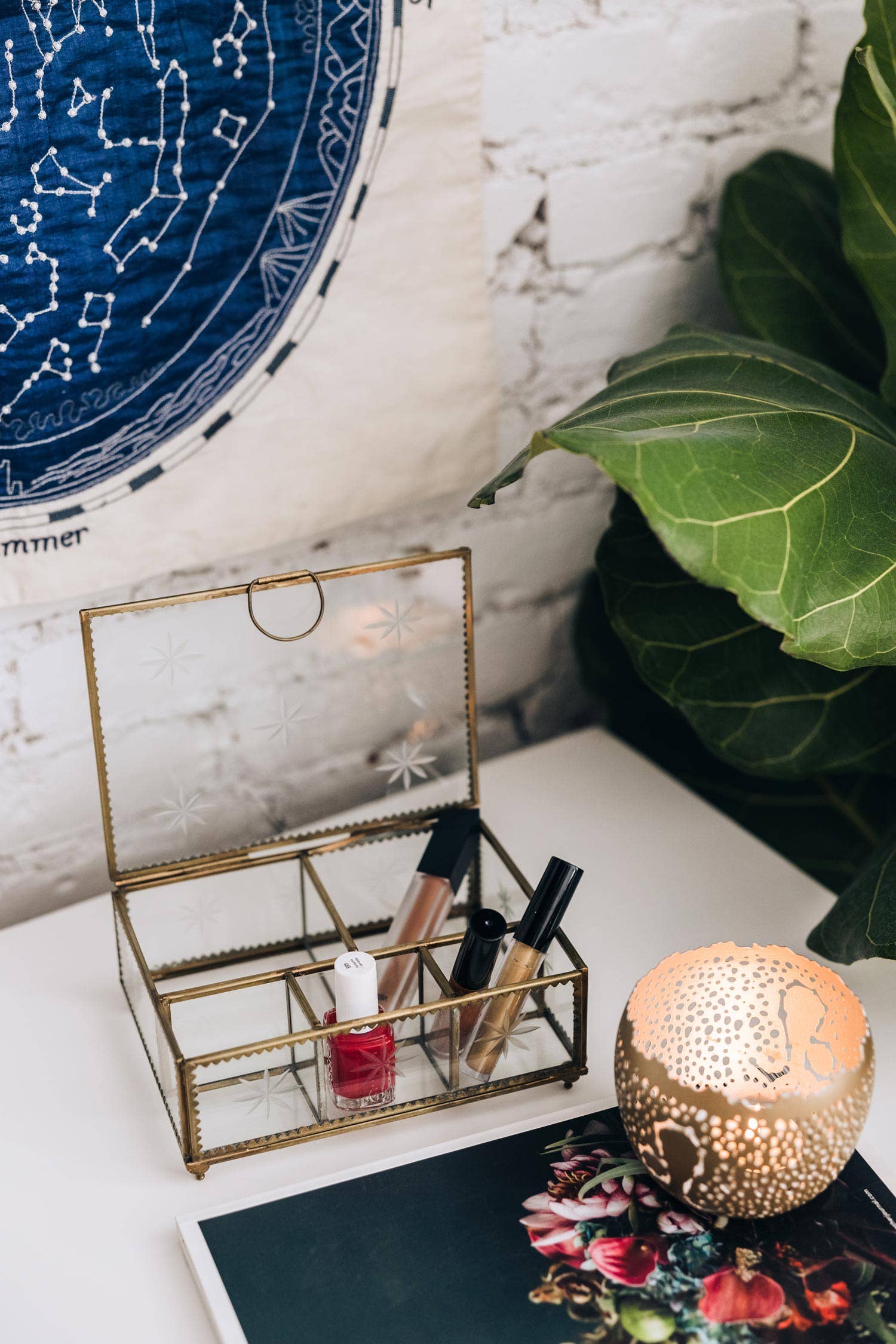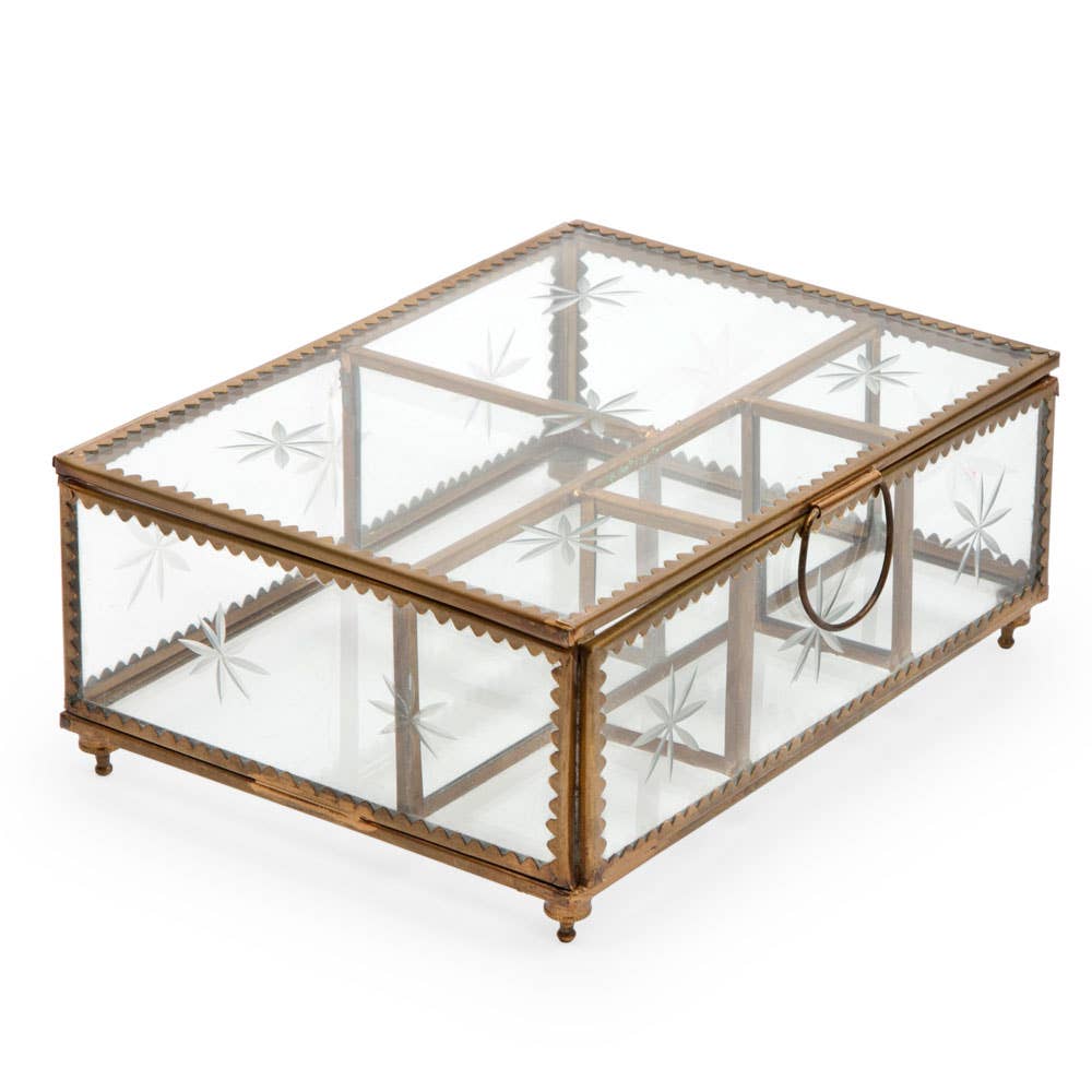 Our classic brass star jewelry box featuring etched glass, is handcrafted in Moradabad, India with an antique fish and gorgeous details.